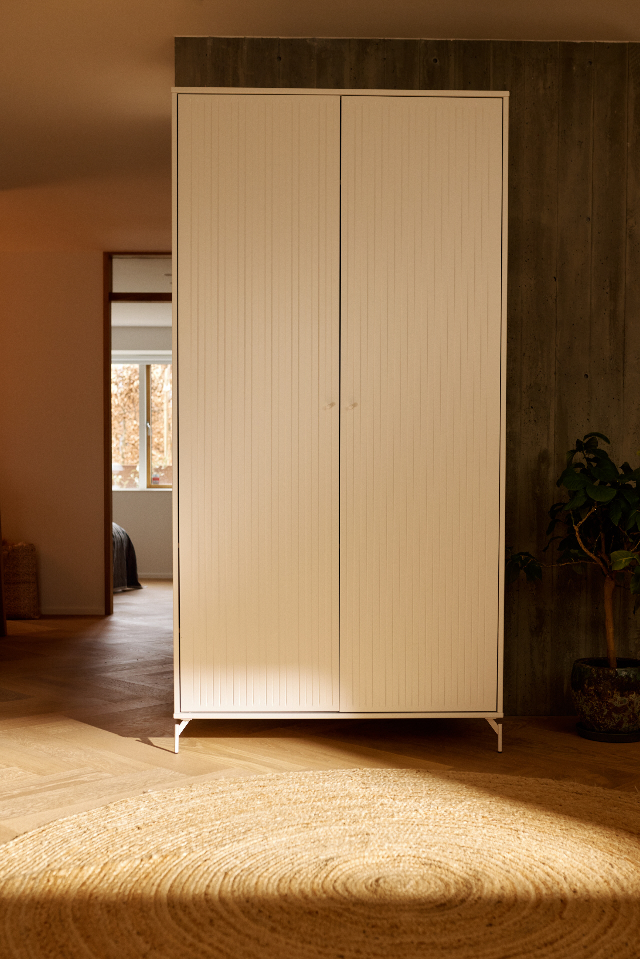 Der Kleiderschrank besteht aus langlebigem, FSC®-zertifiziertem MDF, und der Lack ist frei von schädlichen Substanzen, was Robustheit und Widerstandsfähigkeit garantiert. Wählen Sie zwischen Oat-farbenen Metallfüßen oder grauen Kunststofffüßen – beides ist im Lieferumfang enthalten.