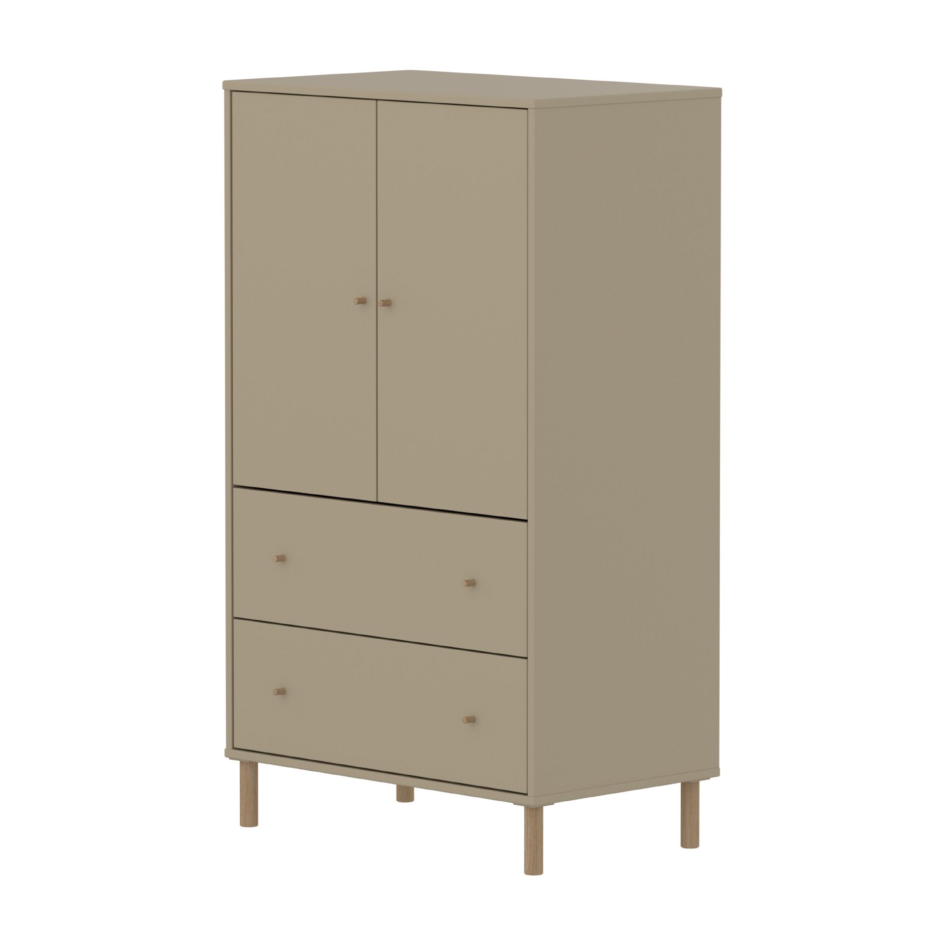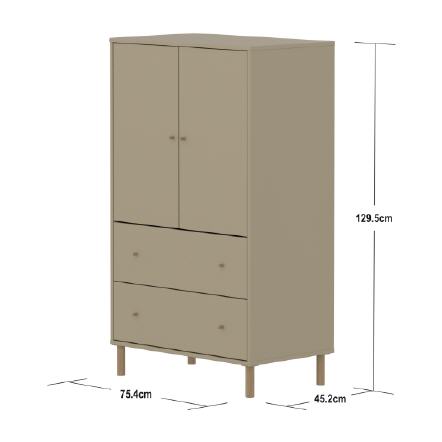 Der FLEXA SAGA Schrank verfügt über zwei Türen zwei Schubladen und einen verstellbaren Einlegeboden. Die Türen mit Soft Close Funktion und die Schubladen schützen kleine Finger und bieten eine elegante und leise Schließfunktion. Die runden Metallgriffe in der Farbe Oat verleihen dem Schrank ein schlichtes und elegantes Design.