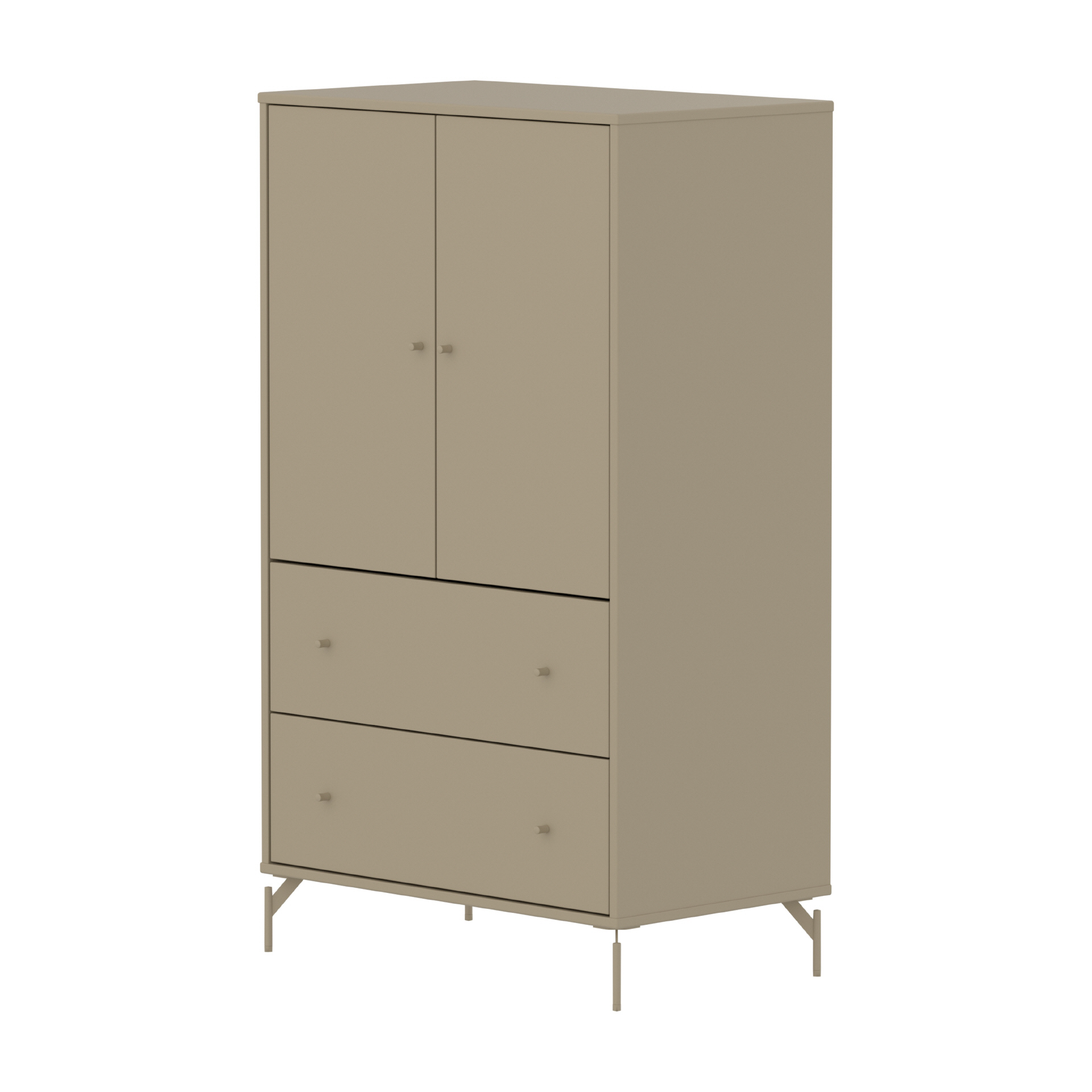 Der FLEXA SAGA Schrank verfügt über zwei Türen zwei Schubladen und einen verstellbaren Einlegeboden. Die Türen mit Soft Close Funktion und die Schubladen schützen kleine Finger und bieten eine elegante und leise Schließfunktion. Die runden Metallgriffe in der Farbe Oat verleihen dem Schrank ein schlichtes und elegantes Design.