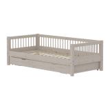 CLASSIC Daybed mit Rückenlehne, Kopf- und Fußteil mit Kreuzleisten und Ausziehbett unter dem Bett. Das Bett ist ideal für Teenager und Übernachtungen mit Freunden oder Familie. Das Bett ist in Grey Washed Kiefernholz erhältlich.