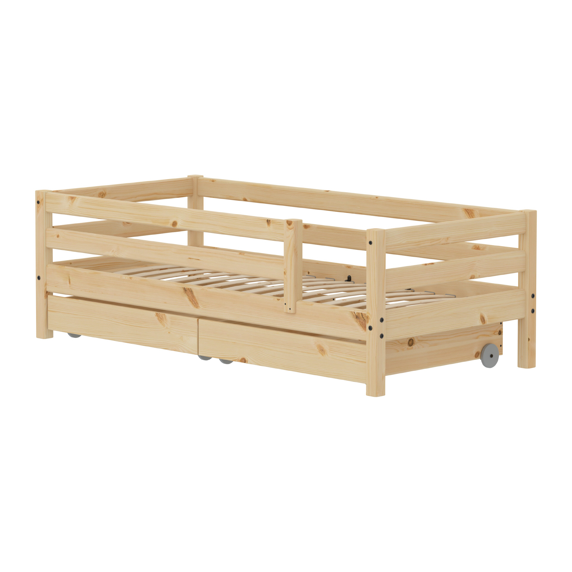 Das Bett besteht aus FSC®-zertifiziertem Massivholz mit abgerundeten Kanten für Sicherheit und Komfort. Die großzügigen Schubladen bieten reichlich Platz für Spielzeug. Dank praktischer Räder lassen sich die Schubladen leicht von Kindern herausziehen. Jede Schublade fasst 88,5 Liter.
