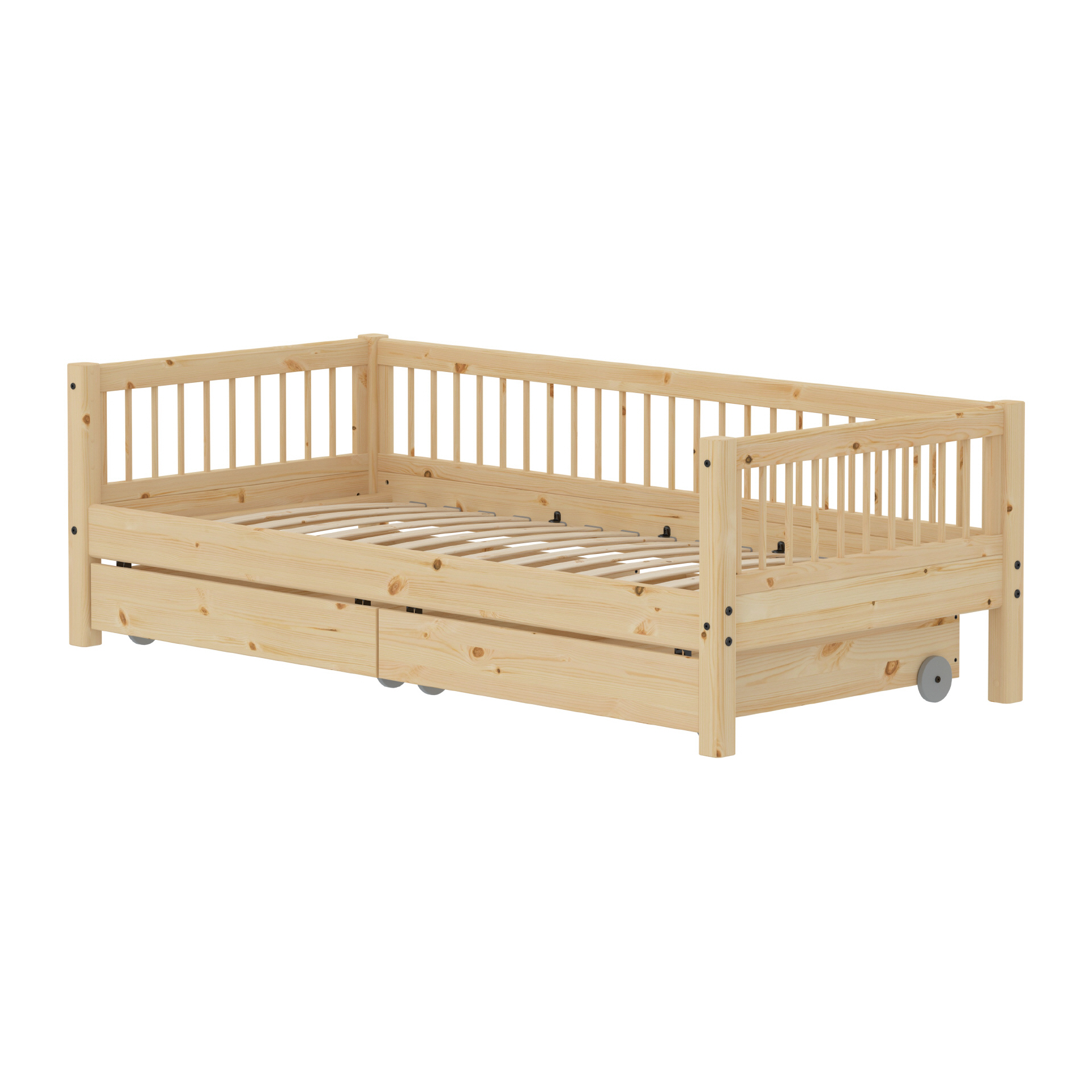 Gefertigt aus FSC®-zertifiziertem, unbehandeltem Kiefernholz, überzeugt das Bett durch seine abgerundeten Kanten, die Sicherheit und Komfort garantieren. Die großzügigen Schubladen bieten Platz für Bettzeug oder Spielzeug und lassen sich dank der gummierten Räder mühelos herausziehen.
