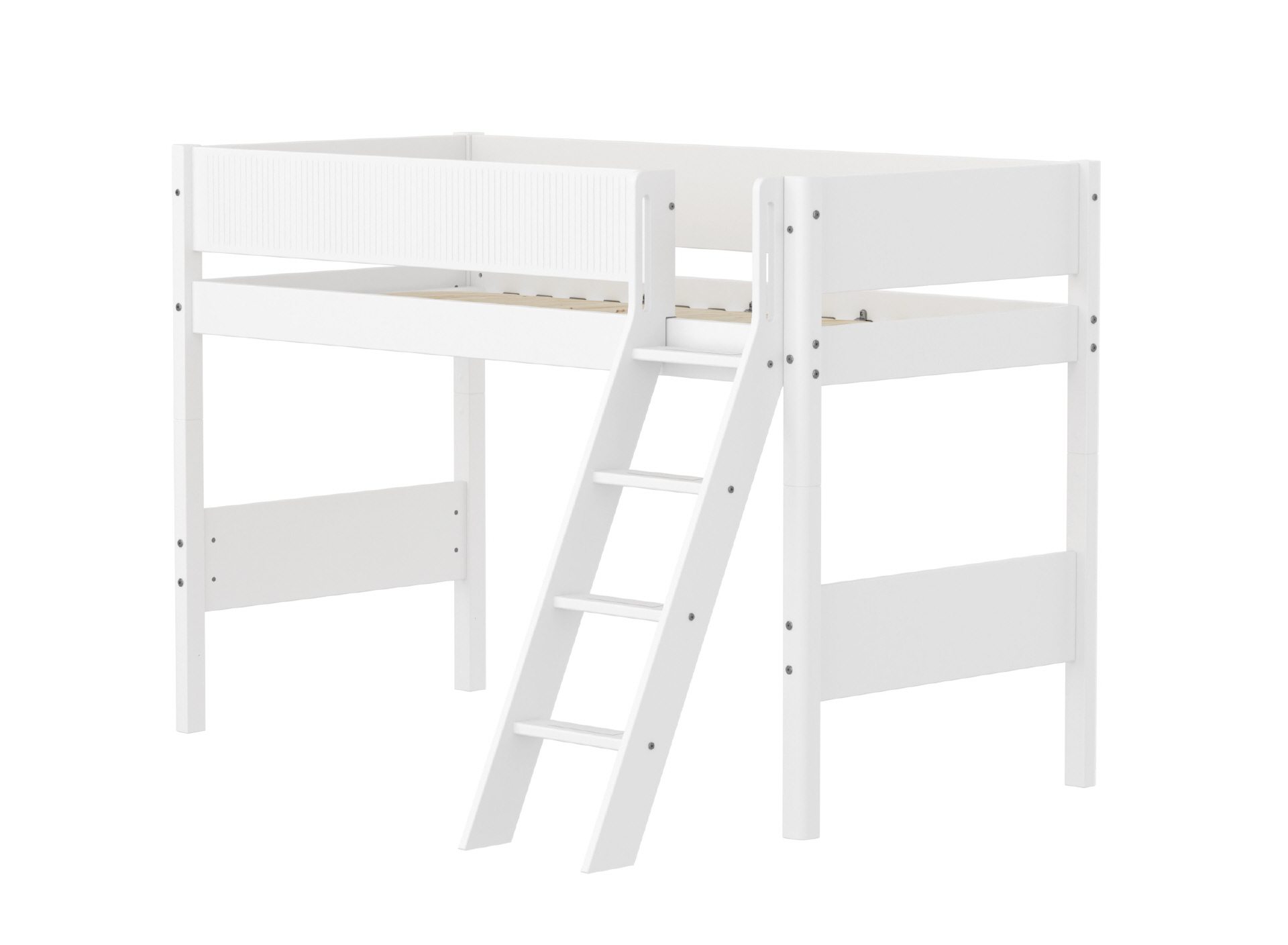 Mittelhohes WHITE Bett mit Schrägleiter für größere Kinder. Die Leiter hat rutschfeste Stufen und integrierte Griffe und kann an beiden Bettenden aufgestellt werden.