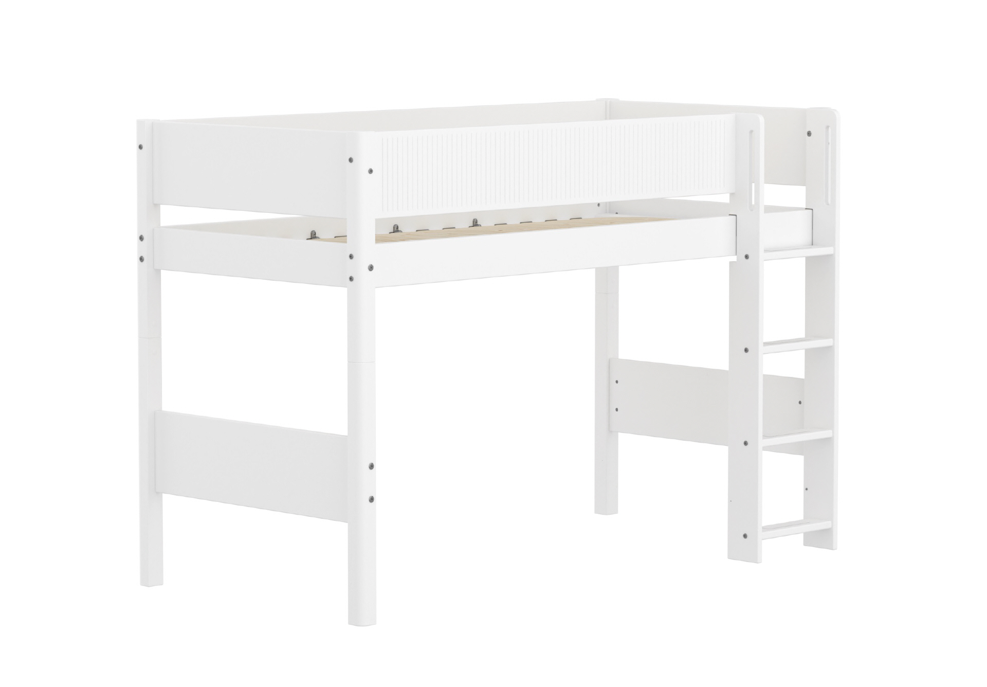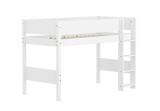 Mittelhohes WHITE Bett mit gerader Leiter für größere Kinder. Die Leiter hat rutschfeste Stufen und integrierte Griffe und kann an beiden Bettenden aufgestellt werden.