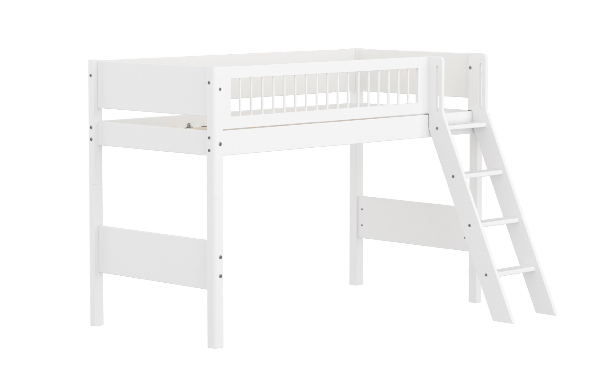 Mittelhohes WHITE Bett mit Schrägleiter für größere Kinder. Die Leiter hat rutschfeste Stufen und integrierte Griffe und kann an beiden Bettenden aufgestellt werden.
