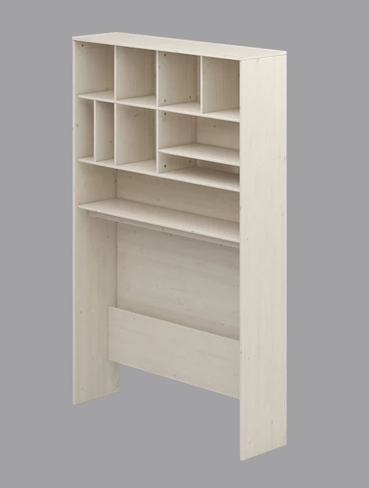 Regalschrank. Der Schrank hat 2 waagerechte und 2 senkrechte feste Einlegeböden sowie 1 waagerechten und 4 senkrechte verstellbare Einlegeböden und eine Kabelrinne. Er kann mit einem Flexa Tisch verwendet werden. Hergestellt aus PEFC zertifizierter massiver Kiefer und Schichtholz.