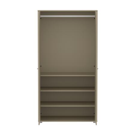 Der Kleiderschrank besteht aus langlebigem, FSC®-zertifiziertem MDF, und der Lack ist frei von schädlichen Substanzen, was Robustheit und Widerstandsfähigkeit garantiert. Beachten Sie, dass im Lieferumfang nur graue Kunststofffüße enthalten sind.