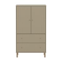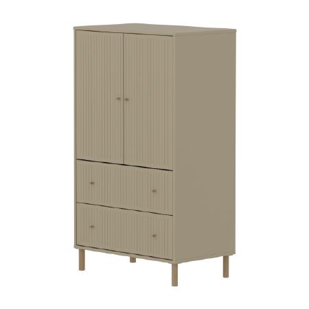 Der FLEXA SAGA Schrank verfügt über zwei Türen zwei Schubladen und einen verstellbaren Einlegeboden. Die Türen mit Soft Close Funktion und die Schubladen schützen kleine Finger und bieten eine elegante und leise Schließfunktion. Die runden Metallgriffe in der Farbe Oat sowie die gerillten Details an den Türen verleihen dem Schrank ein schlichtes und elegantes Design.