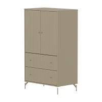 Der FLEXA SAGA Schrank verfügt über zwei Türen zwei Schubladen und einen verstellbaren Einlegeboden. Die Türen mit Soft Close Funktion und die Schubladen schützen kleine Finger und bieten eine elegante und leise Schließfunktion. Die runden Metallgriffe in der Farbe Oat sowie die gerillten Details an den Türen verleihen dem Schrank ein schlichtes und elegantes Design.