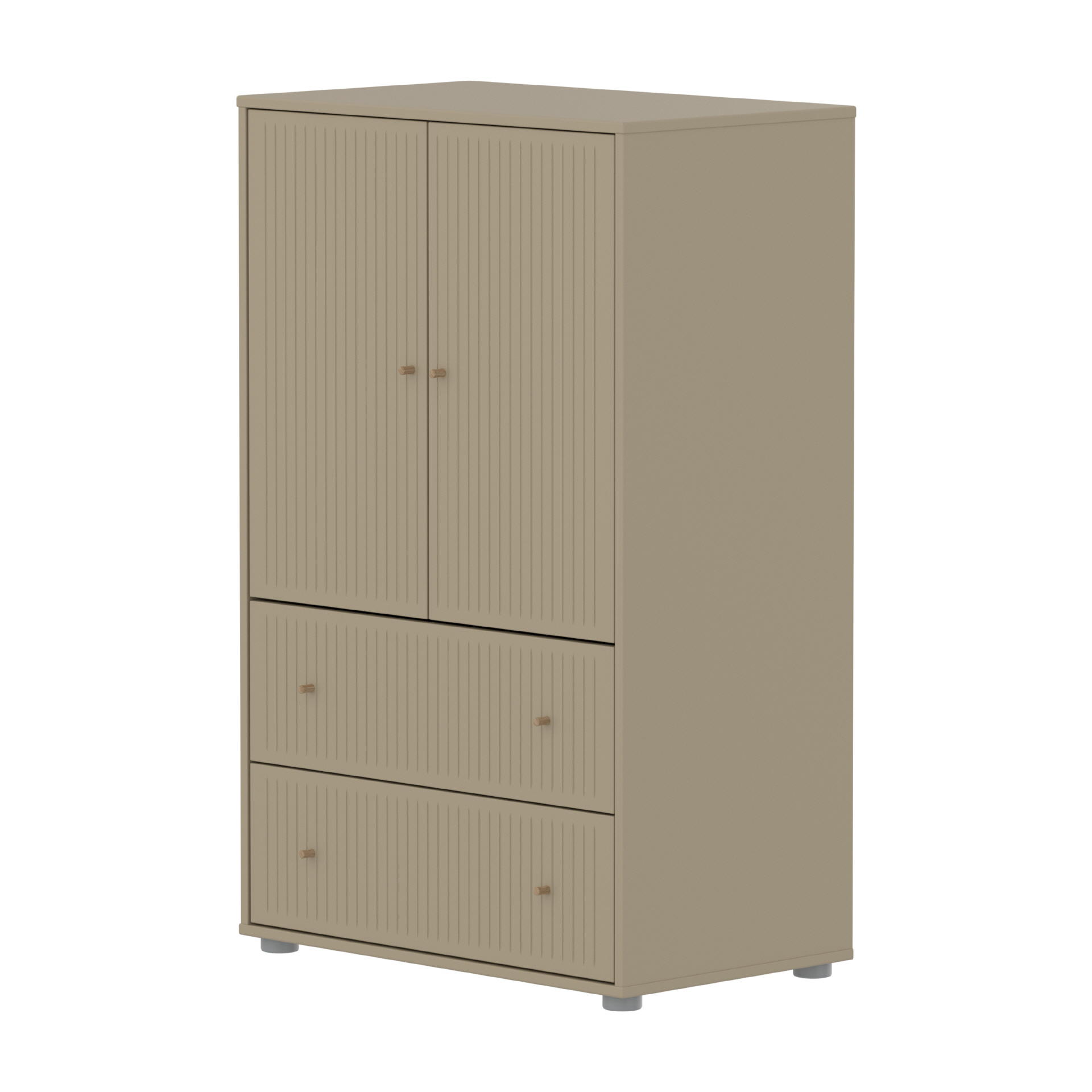 Der FLEXA SAGA Schrank verfügt über zwei Türen zwei Schubladen und einen verstellbaren Einlegeboden. Die Türen mit Soft Close Funktion und die Schubladen schützen kleine Finger und bieten eine elegante und leise Schließfunktion. Die runden Metallgriffe in der Farbe Oat sowie die gerillten Details an den Türen verleihen dem Schrank ein schlichtes und elegantes Design.