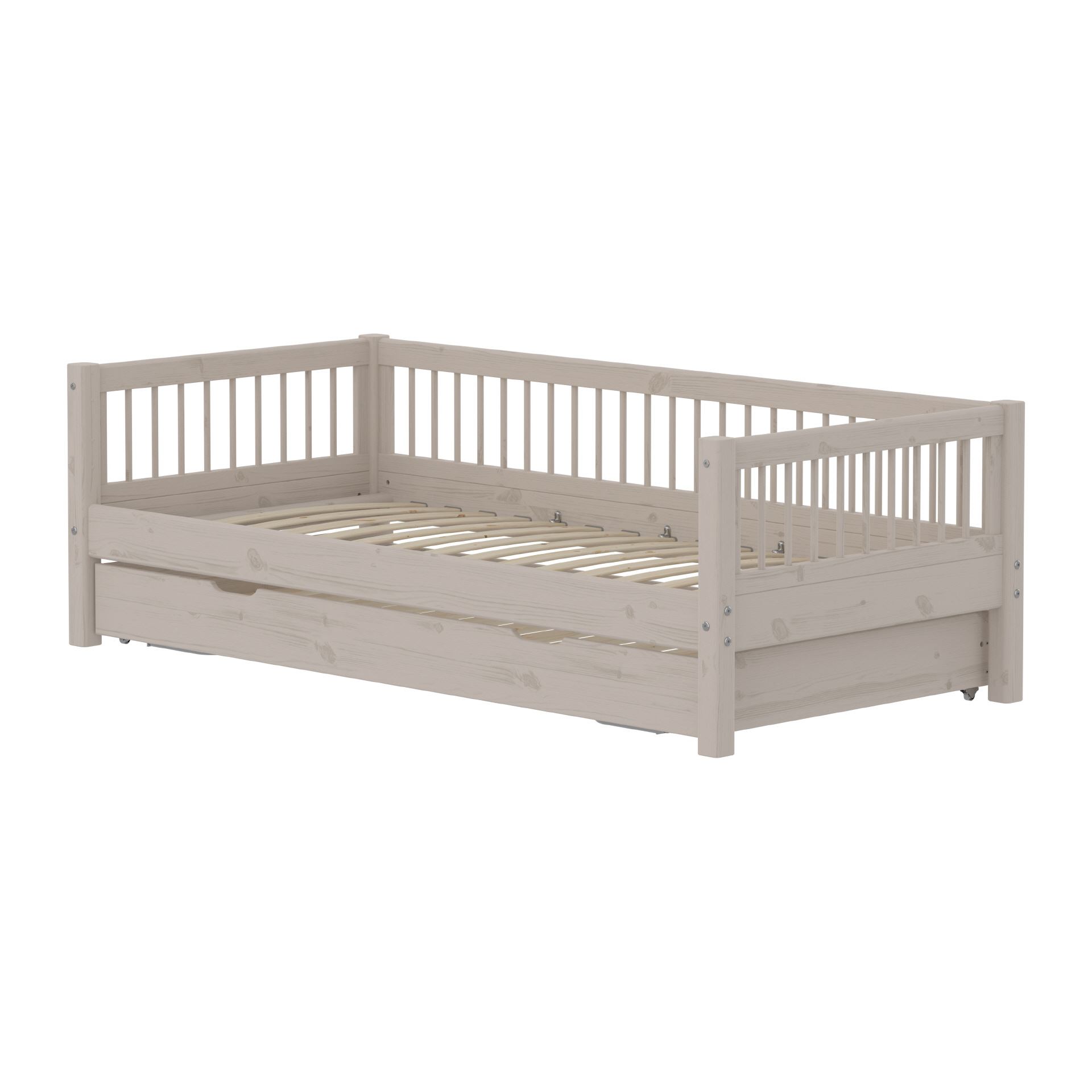 CLASSIC Daybed mit Rückenlehne, Kopf- und Fußteil mit Kreuzleisten und Ausziehbett unter dem Bett. Das Bett ist ideal für Teenager und Übernachtungen mit Freunden oder Familie. Das Bett ist in Grey Washed Kiefernholz erhältlich.