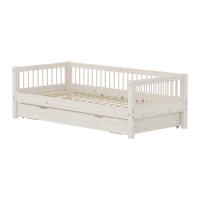 CLASSIC Daybed mit Rückenlehne, Kopf- und Fußteil mit Kreuzleisten und Ausziehbett unter dem Bett. Das Bett ist ideal für Teenager und Übernachtungen mit Freunden oder Familie. Das Bett ist in White Washed Kiefernholz erhältlich.