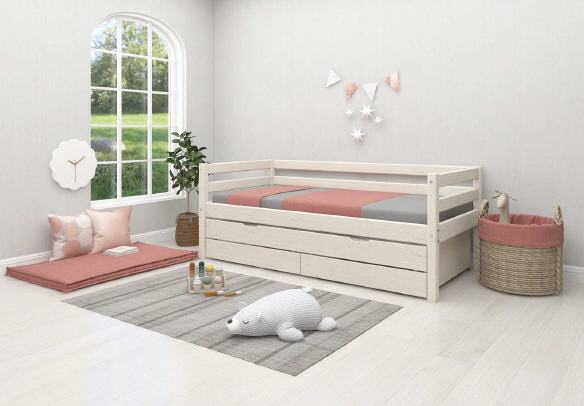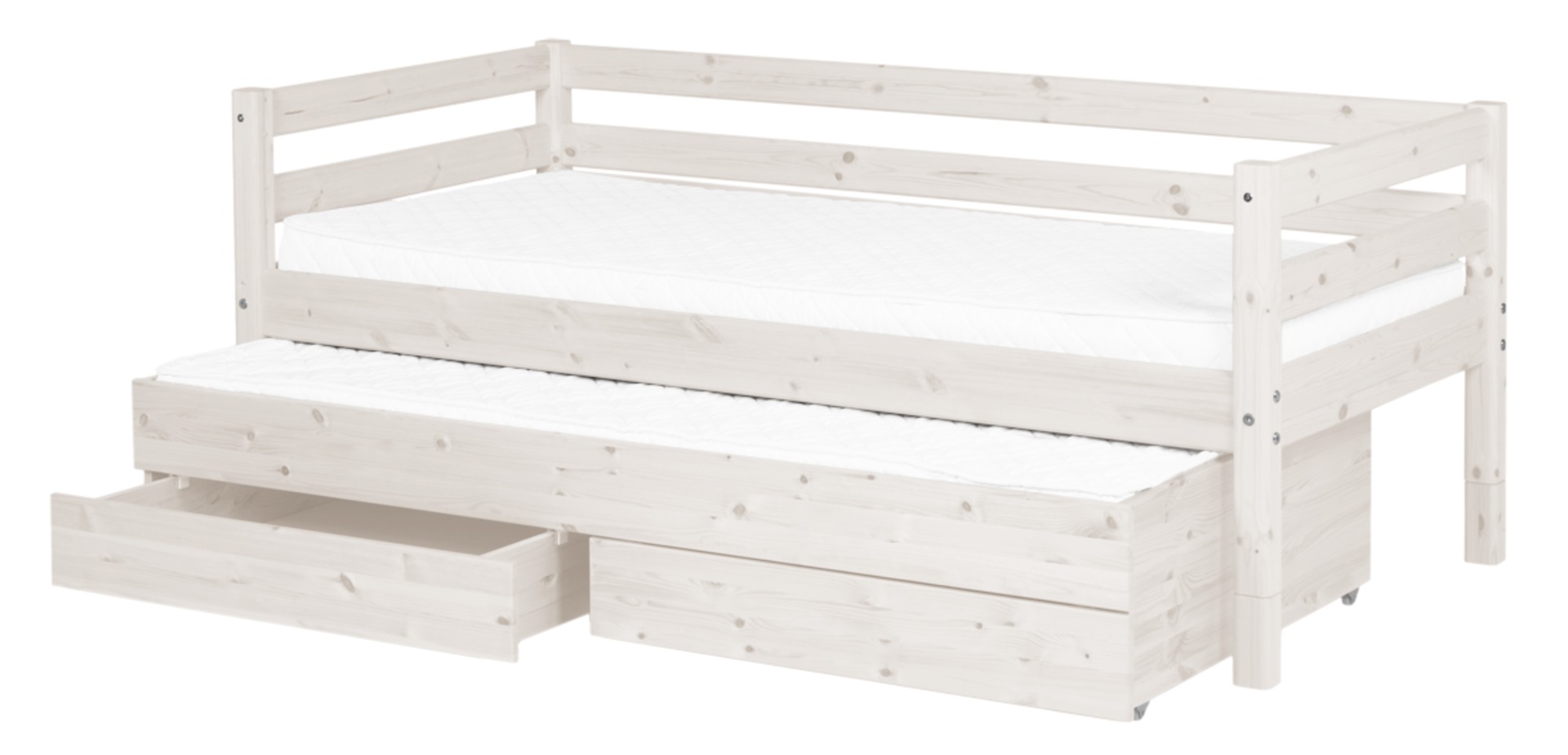 Classic Bett mit hinterer Absturzsicherung .Ausziehbett und 2 Schubladen, inklusive Griffen und Laufrollen. H:81 L:210 B:100 cm