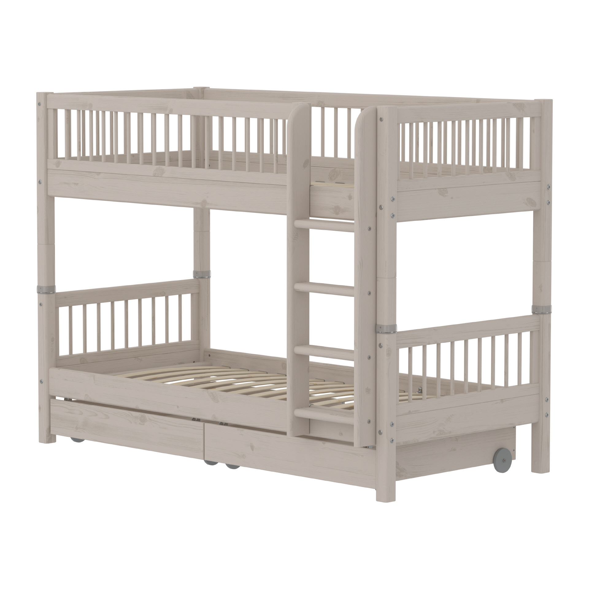 Die Schubladen unter dem Bett sind ideal zur Aufbewahrung von Bettwäsche oder Spielzeug des Kindes. Die Schubladen haben praktische Rollen, die es den Kindern ermöglichen, sie einfach unter dem Bett herauszuziehen. Jede Schublade hat ein Volumen von 88,5 Litern. Das Bett ist aus massivem Kiefernholz gefertigt und in Grey Washed erhältlich.
