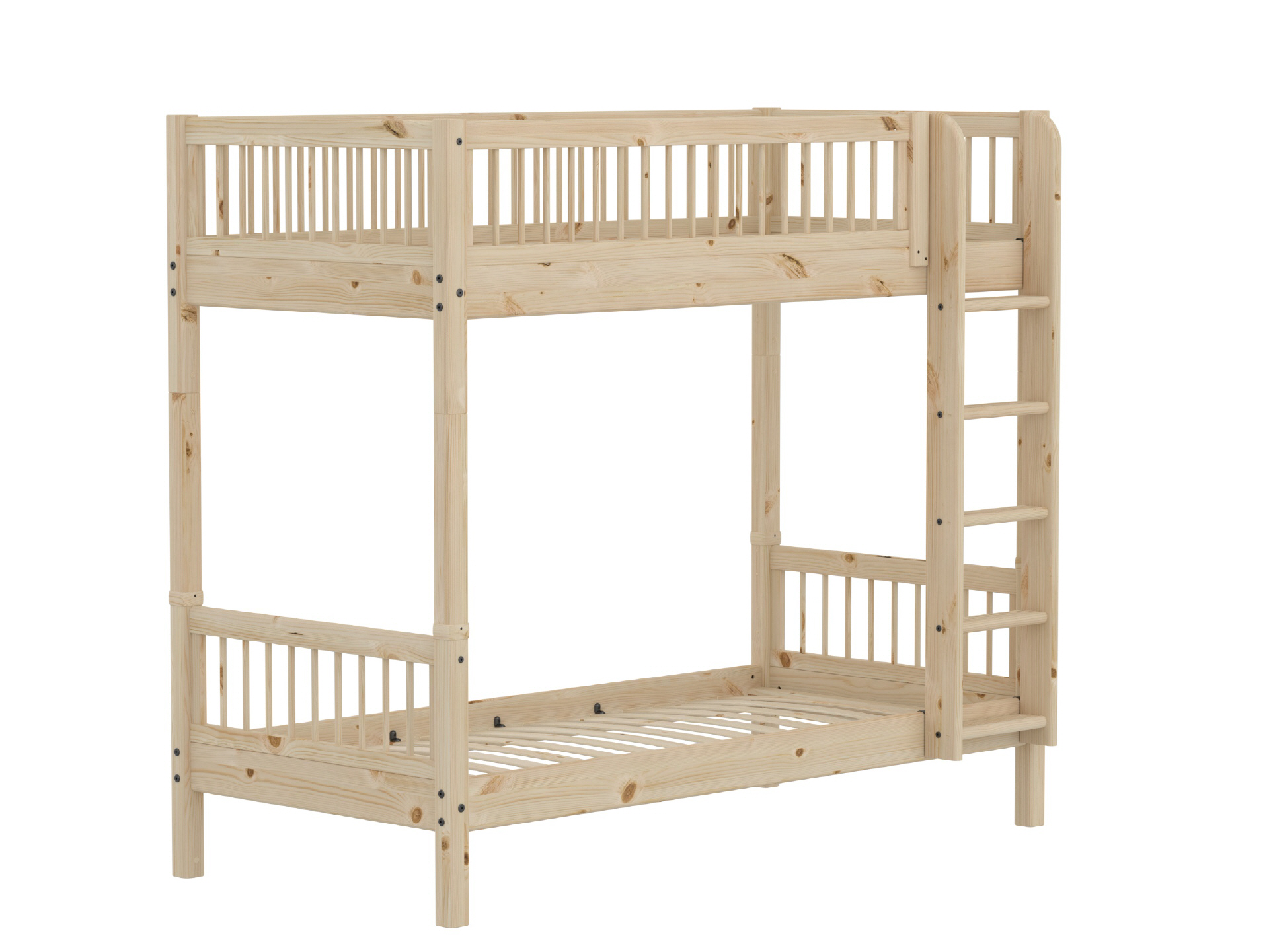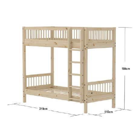 CLASSIC Etagenbett mit extra Höhe. Das Etagenbett ist mit einer geraden Leiter ausgestattet und eine ideale, platzsparende Lösung für kleinere Wohnungen. Die Leiter hat rutschfeste Stufen und kann an beiden Bettenden aufgestellt werden. Das Bett besteht aus massivem Kiefernholz. Altersempfehlung: Ab 6 Jahren. Ein Kind kann ab dem Alter von 3 Jahren im unteren Bett, das mit einem Absturzsicherung ausgestattet ist, schlafen.