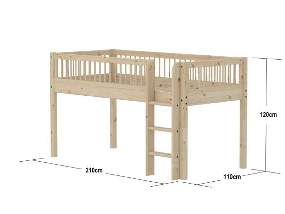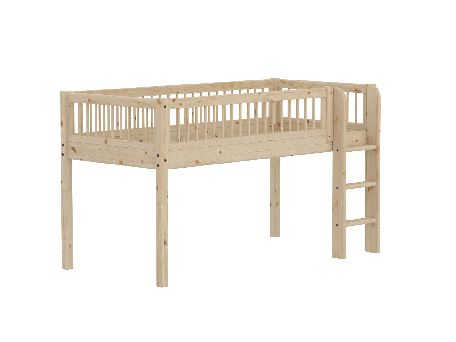 Halbhohes CLASSIC Bett mit gerader Leiter und Absturzsicherung für Kinder. Die Leiter hat rutschfeste Stufen und kann an beiden Bettenden aufgestellt werden. Der Raum unter dem halbhohen Bett eignet sich ideal als Stauraum. Mit den FLEXA Spielvorhängen können Sie unter dem Bett ein privates kleines Reich für Ihr Kind schaffen. Die Höhle lässt sich auf das Bett stellen. Mit einem anderen Absturzsicherung und einer Rutsche am mittelhohen Bett wird das Kinderzimmer zum Spielplatz. Die CLASSIC Kollektion wächst mit dem Kind. Wenn Sie kurze Pfosten an das halbhohe Bett montieren, wird daraus ein Einzelbett. Wenn Sie lange Pfosten an das Bett montieren, wird daraus ein Hochbett. Das Bett besteht aus massivem Kiefernholz.
