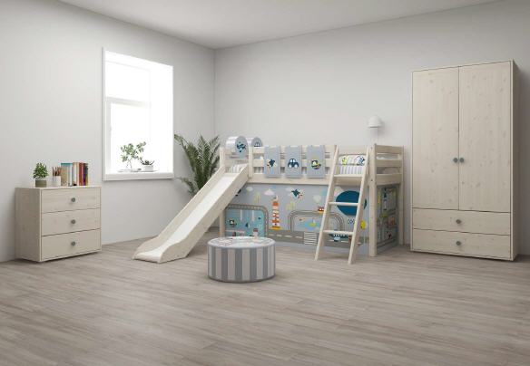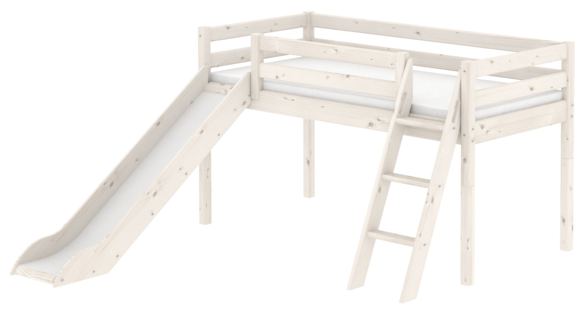 Halbhohes Classic Bett mit Rutsche und neuer Schrägleiter mit integrierten Griffen. H:120 L:210 B:249 cm