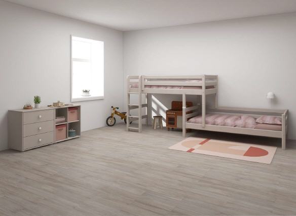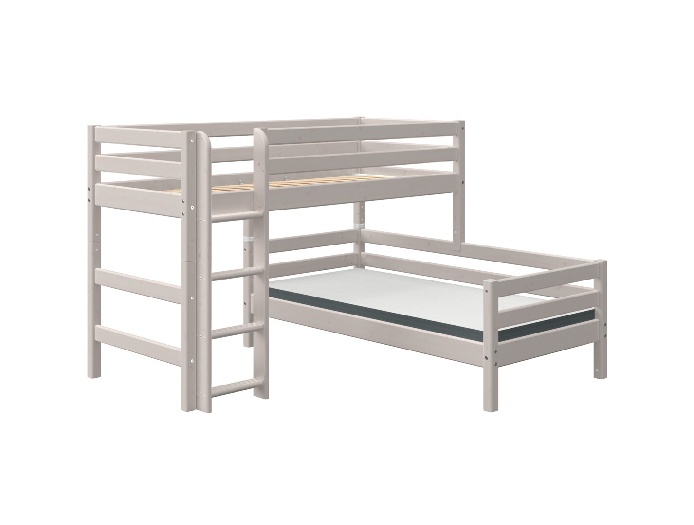 Mittelhohes Classic Kombibett mit senkrechter Leiter. H:143 L:210 B:210 cmH:143 L:250-375 B:110 cm