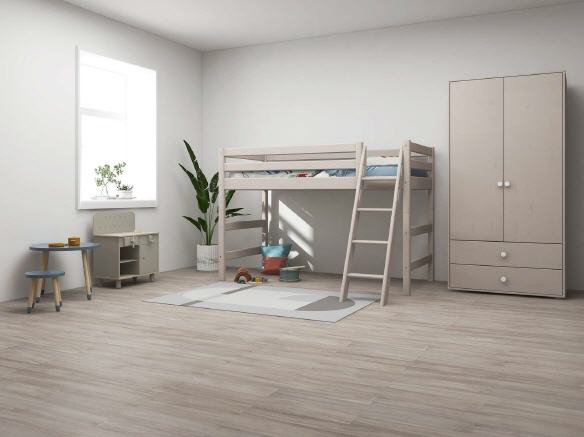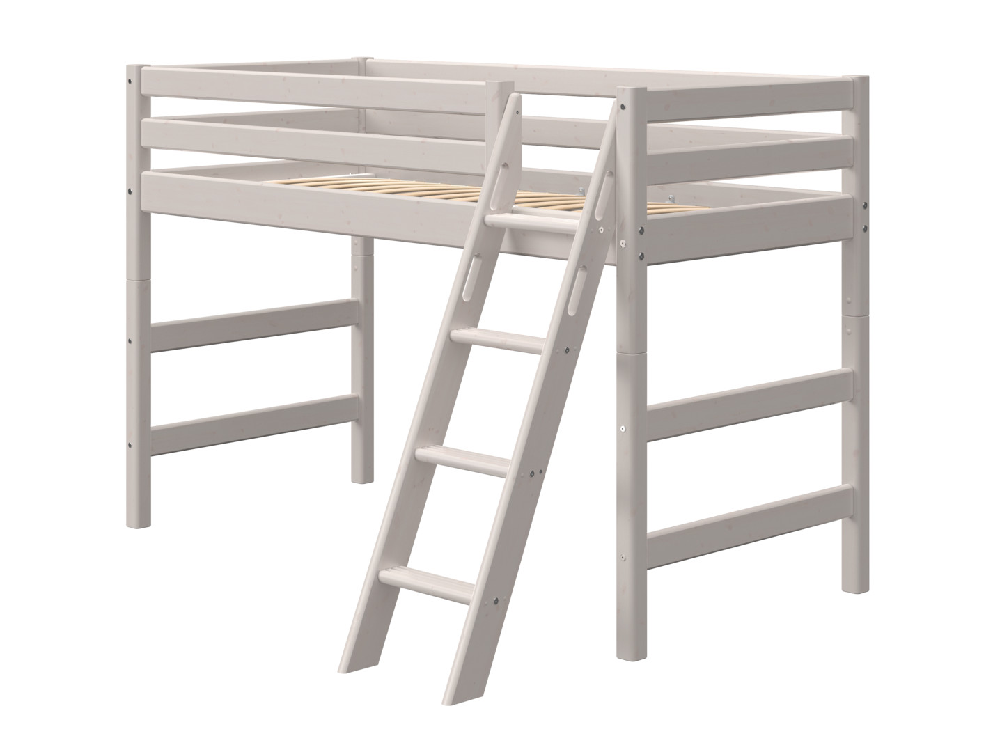 Mittelhohes Classic Bett mit neuer Schrägleiter mit integrierten Griffen. H:143 L:210 B:157 cm