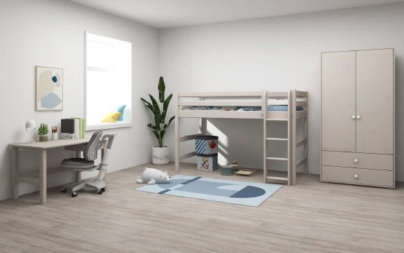 Mittelhohes Bett-Classic-m.senkr.Leiter-Grau las.