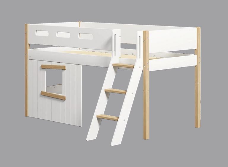 Halbhohes NOR Bett mit Hausfront und einer schrägen Leiter.