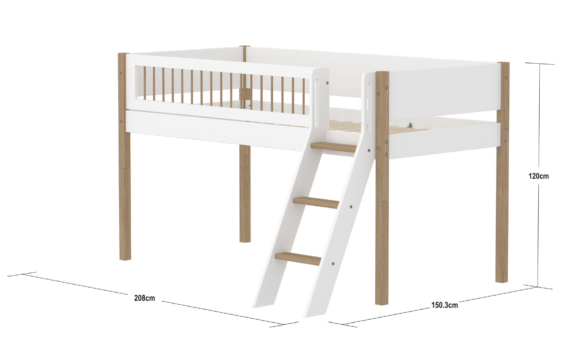 Halbhohes NOR Bett mit Schrägleiter und Absturzsicherung für Kinder. Die Leiter hat rutschfeste Stufen und integrierte Griffe und kann an beiden Bettenden aufgestellt werden. Der Raum unter dem halbhohen Bett eignet sich ideal als Stauraum.