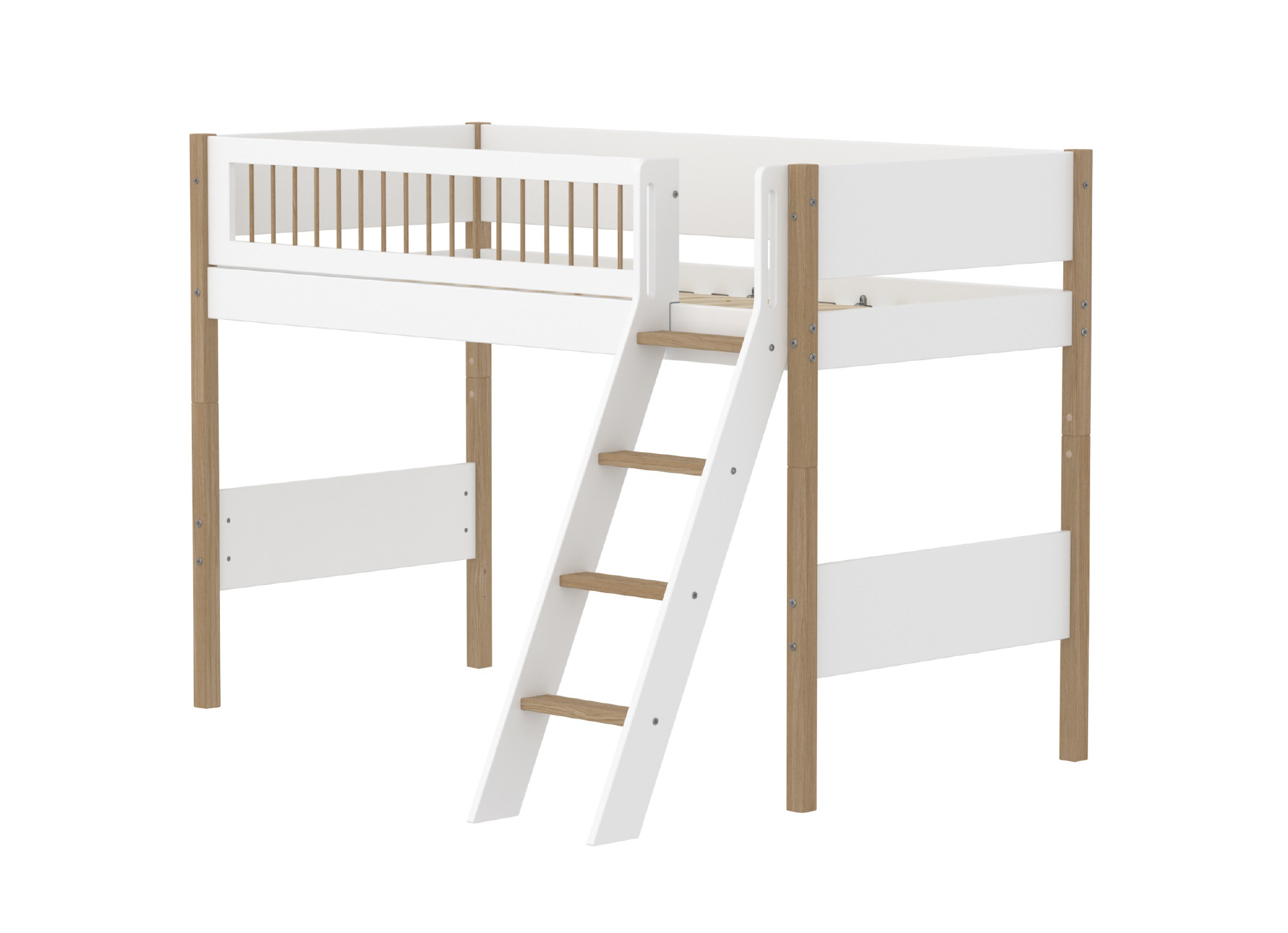 Mittelhohes NOR Bett mit Schrägleiter für größere Kinder. Die Leiter hat rutschfeste Stufen und integrierte Griffe und kann an beiden Bettenden aufgestellt werden.