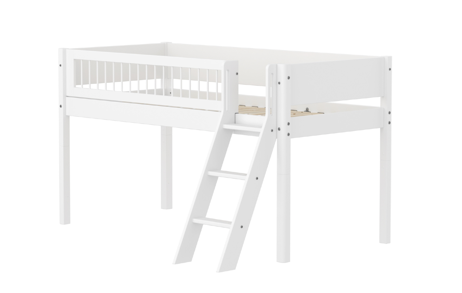 Halbhohes WHITE Bett mit Schrägleiter und Absturzsicherung. Die Leiter hat rutschfeste Stufen und integrierte Griffe und kann an beiden Bettenden aufgestellt werden.