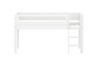 Halbohes WHITE Bett mit gerader Leiter und Absturzsicherung. Die Leiter hat rutschfeste Stufen und integrierte Griffe und kann an beiden Bettenden aufgestellt werden.
