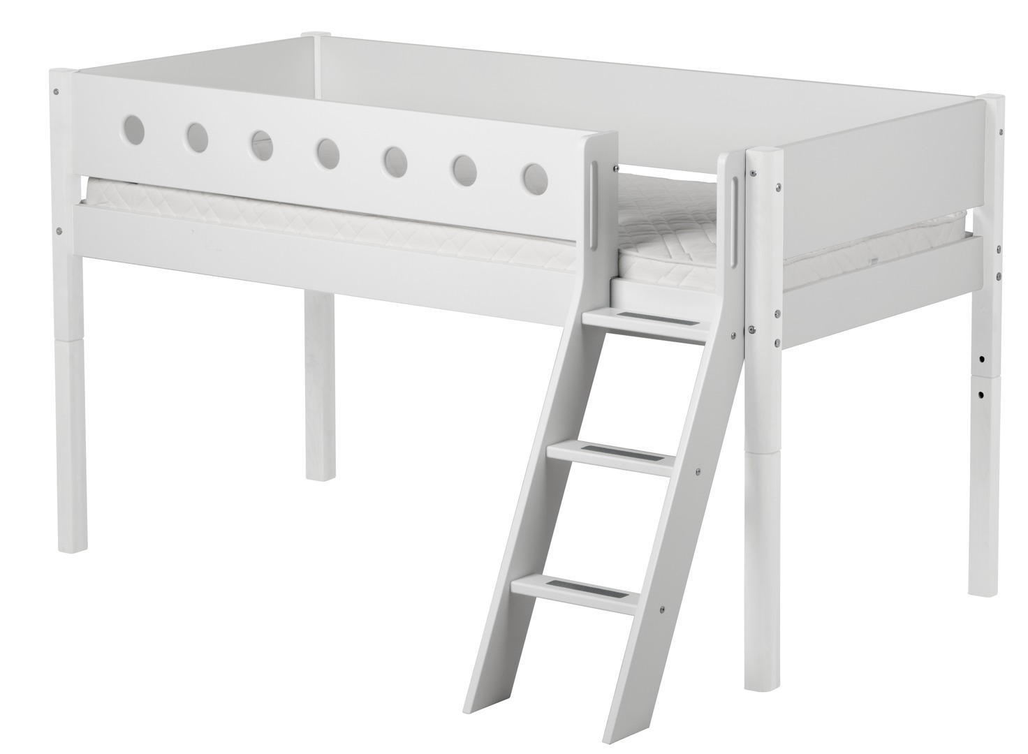 White MDF halbhohes Bett mit Schrägleiter und farbiger Absturzsicherung, weiss/weiss/weiss.Pfosten aus Birke.H:120 L:210 B:151 cm