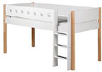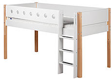 White MDF halbhohes Bett mit farbiger Absturzsicherung, senkrechter Leiter, weiss/natur/weiss.H:120 L:210 B:109 cm