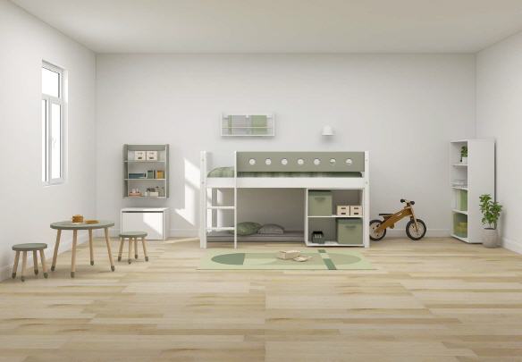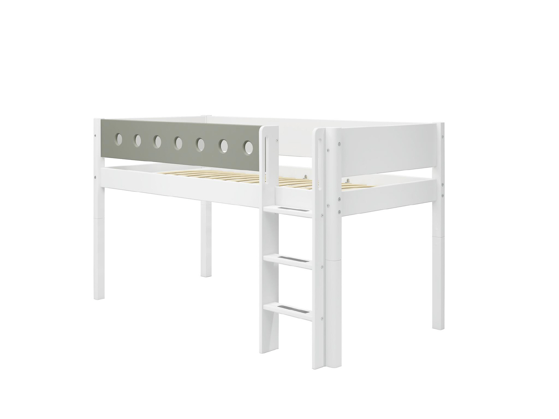 White MDF halbhohes Bett mit farbiger Absturzsicherung, senkrechter Leiter.Pfosten aus Birke.H:120 L:210 B:109 cm