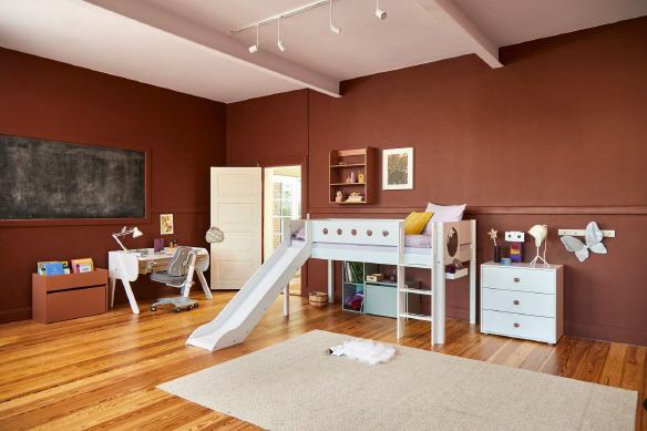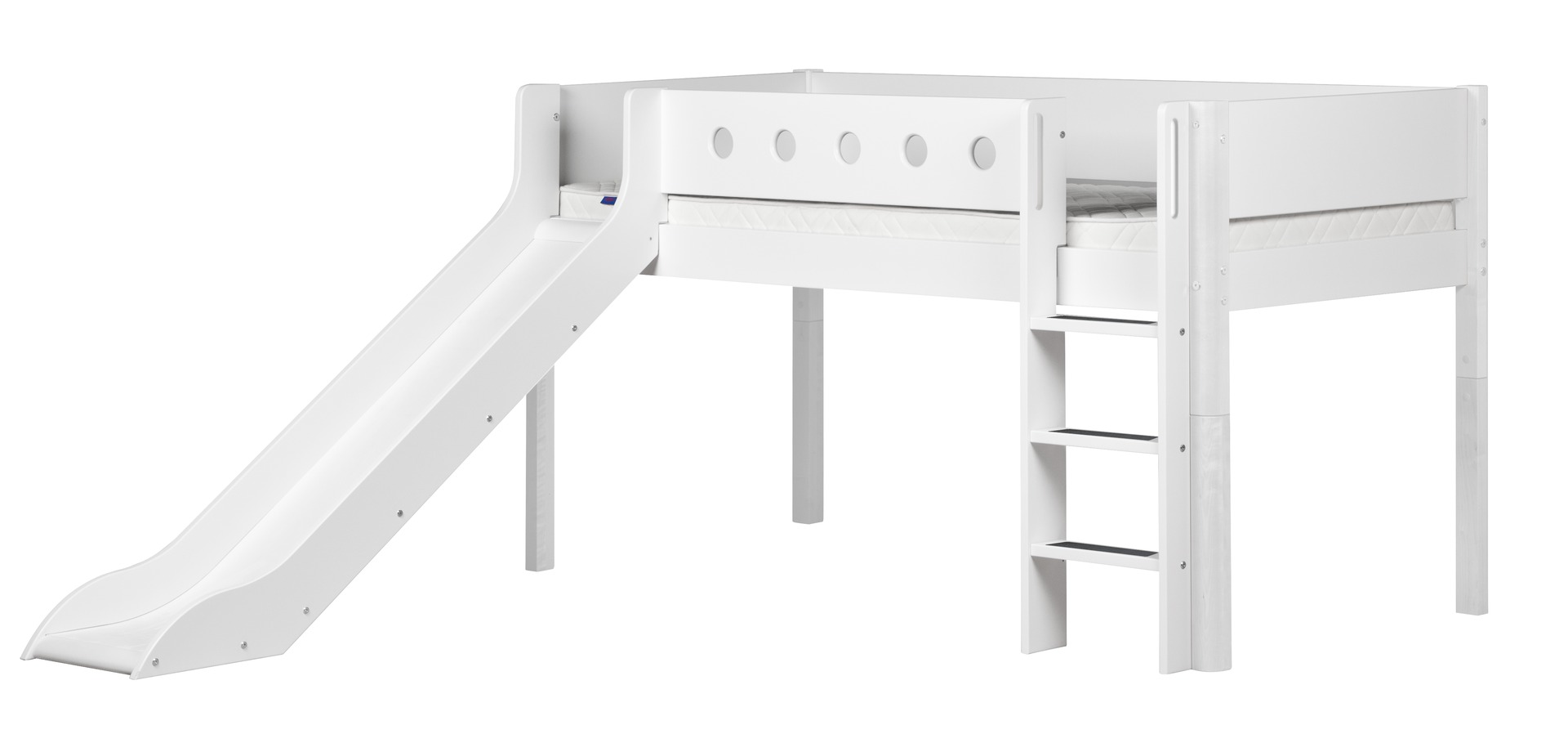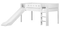White MDF halbhohes Bett mit farbiger Absturzsicherung, senkrechter Leiter + Rutsche, weiss/weiss/weiss. Pfosten aus Birke.H:120 L:210 B:250 cm