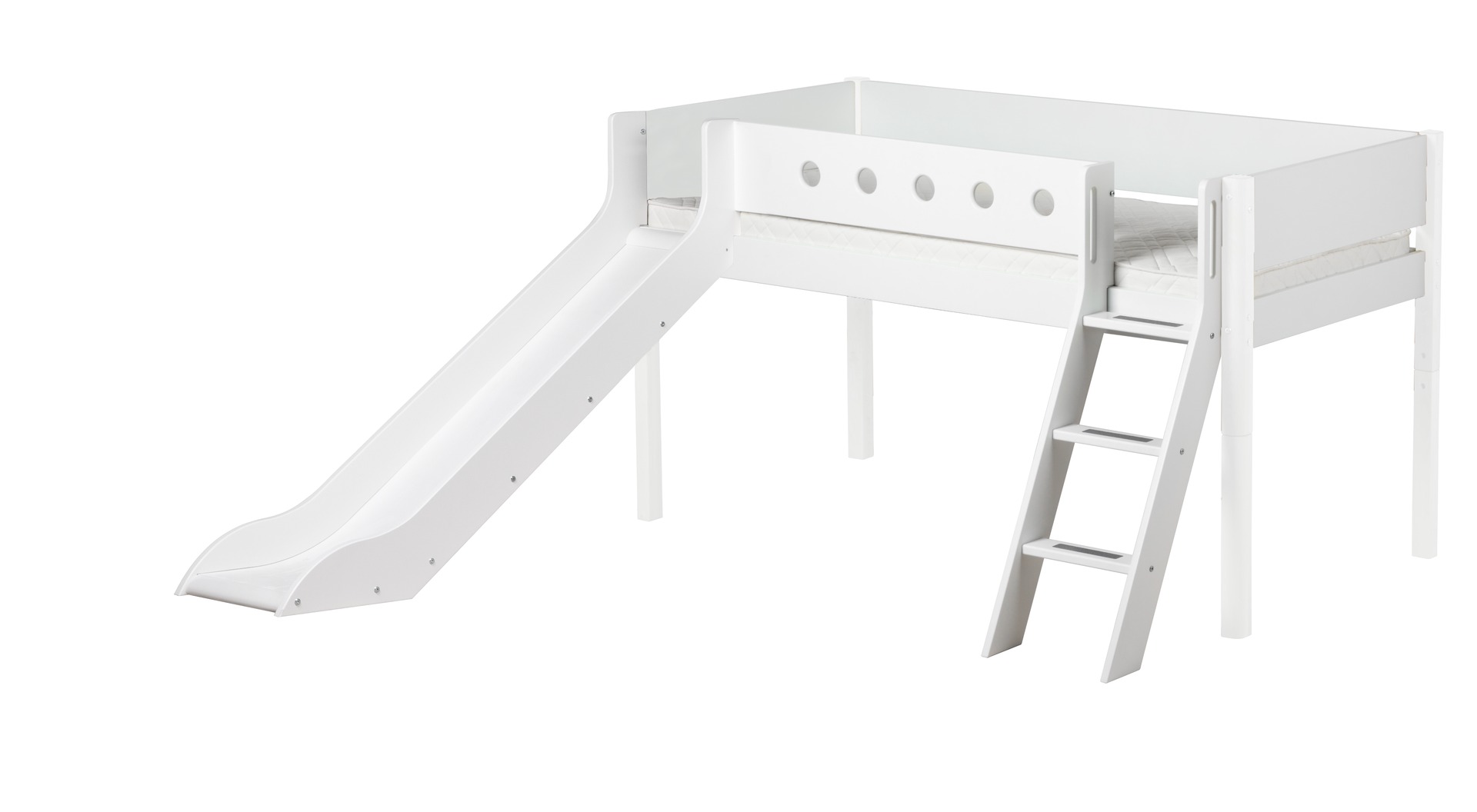 White MDF halbhohes Bett mit farbiger Absturzsicherung, Schrägleiter + Rutsche.Pfosten aus Birke.H:120 L:210 B:250 cm