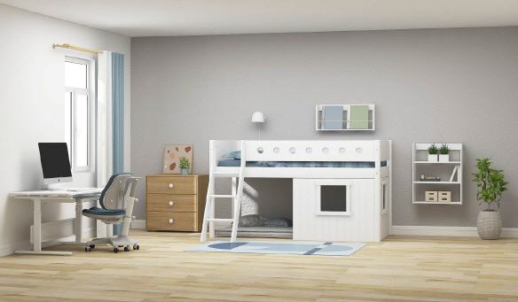 Absturzsicherung und Hausfronten aus MDF. Bett,Fensterrahmen und Pfosten aus Kiefernholz, alles weiss lackiert.H:120 L:210 B:151 cm