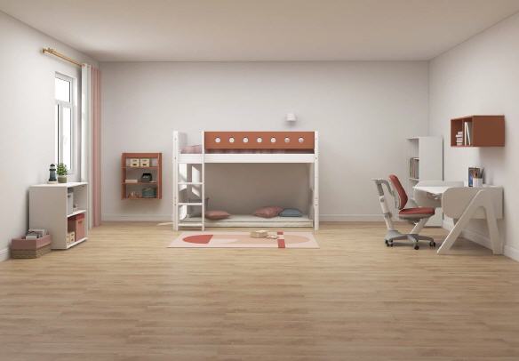 White MDF mittelhohes Bett mit farbiger Absturzsicherung.