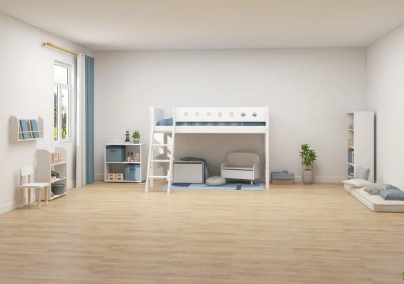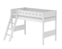 White MDF mittelhohes Bett mit farbiger Absturzsicherung.Pfosten aus Birke.H:143 L:210 W:159 cm
