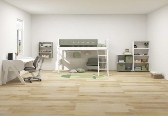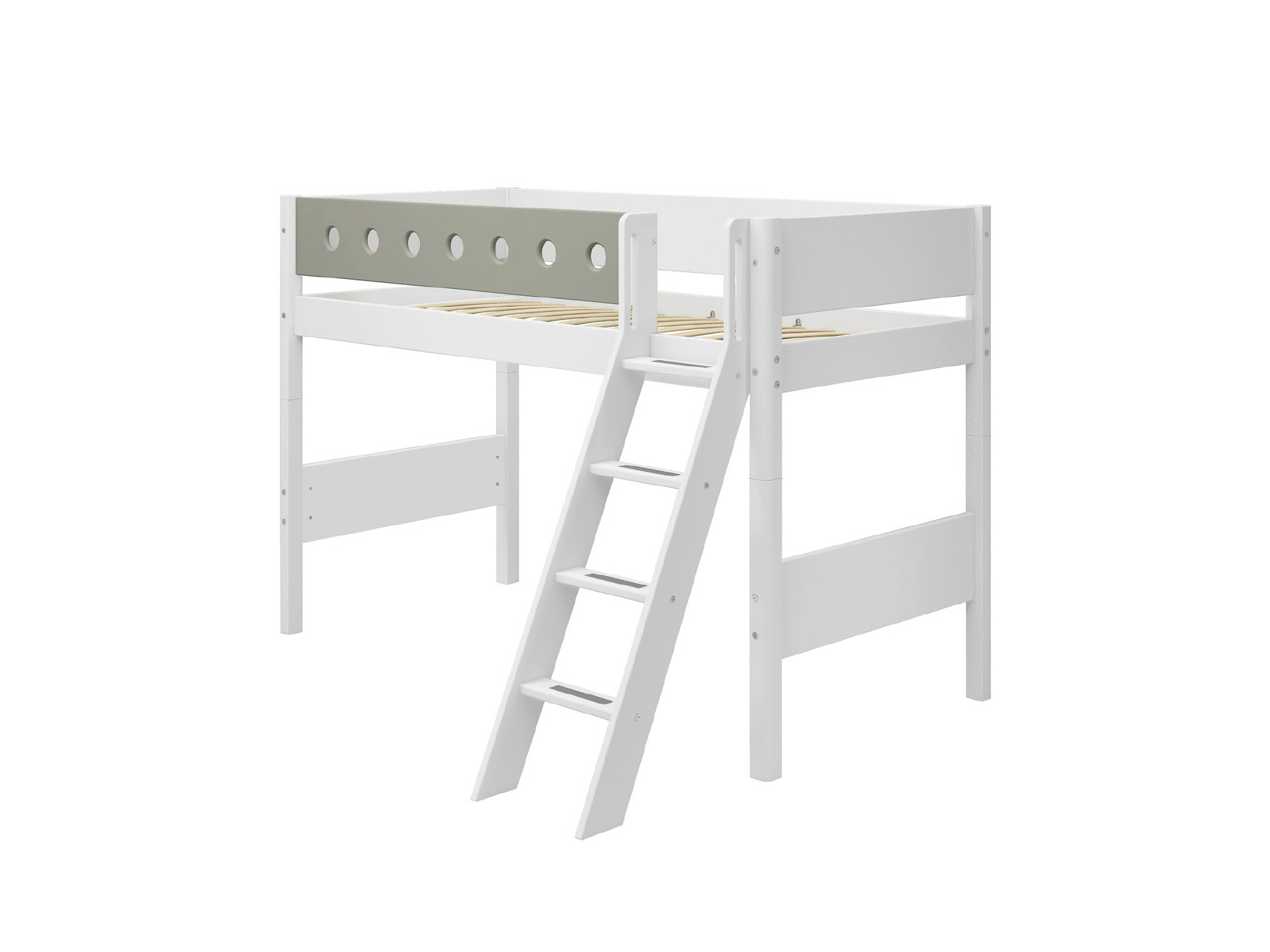 White MDF mittelhohes Bett mit farbiger Absturzsicherung.Pfosten aus Birke.H:143 L:210 W:159 cm