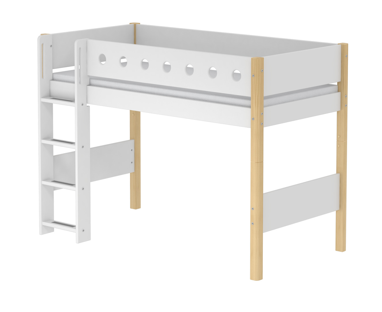 White MDF mittelhohes Bett mit Absturzsicherung.Pfosten aus Birke.Sonderpreis aus der Ausstellung EssenH:143 L:210 W:109 cm