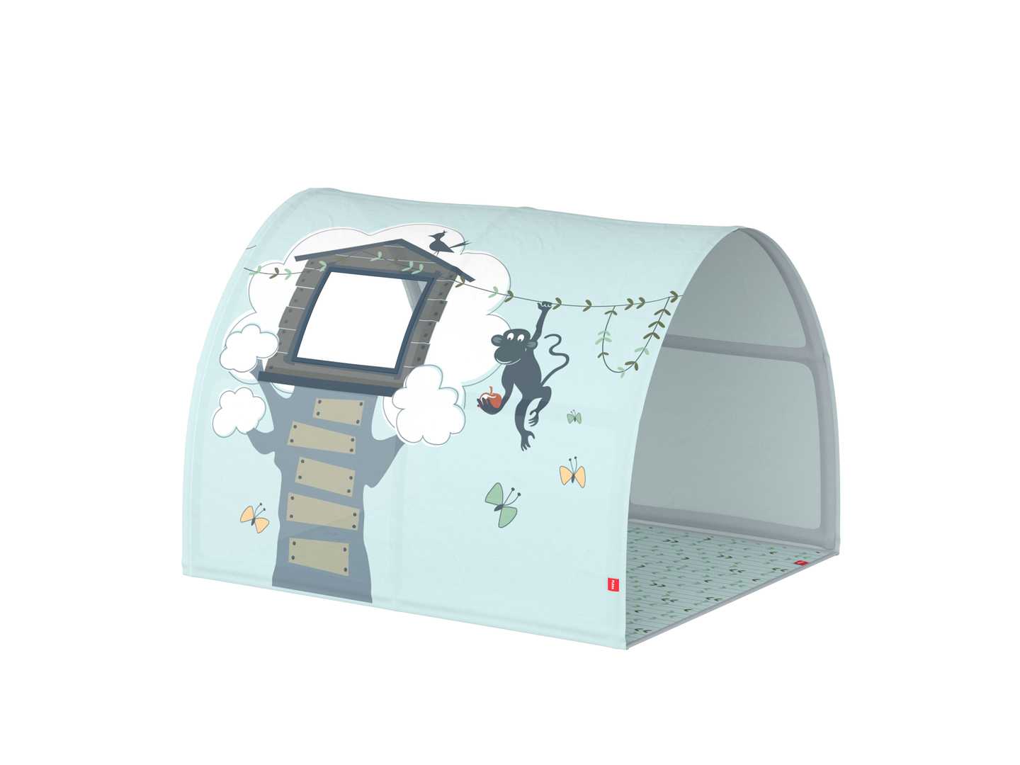 Die Steppdecke dient als Fußboden und wird per Kletttechnik befestigt. Dadurch kann die Höhle auch ausserhalb des Bettes freistehend genutzt werden.