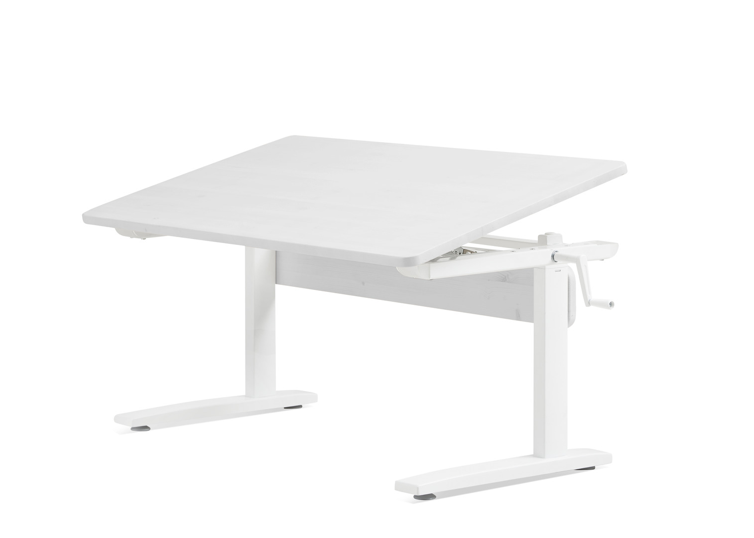 Schreibtisch höhenverstellbar mit neigbarer Tischplatte und einem weißen Metallgestell.H:53,5 bis 76,5 cm ; L:120 T:70 cmTischplatte=Weiss mit sichtbarer MaserungBeine= Weiss