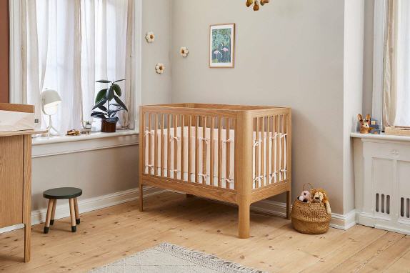 Das Bettnestchen hat eine abnehmbare Vorderseite. Wenn es an der Zeit ist, die vorderen Gitterstäbe am Kinderbett herauszunehmen, kann auch das Vorderteil des Bettnestchens abgenommen werden. Erhältlich in mehreren pastelligen, wohltuenden Farben."