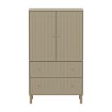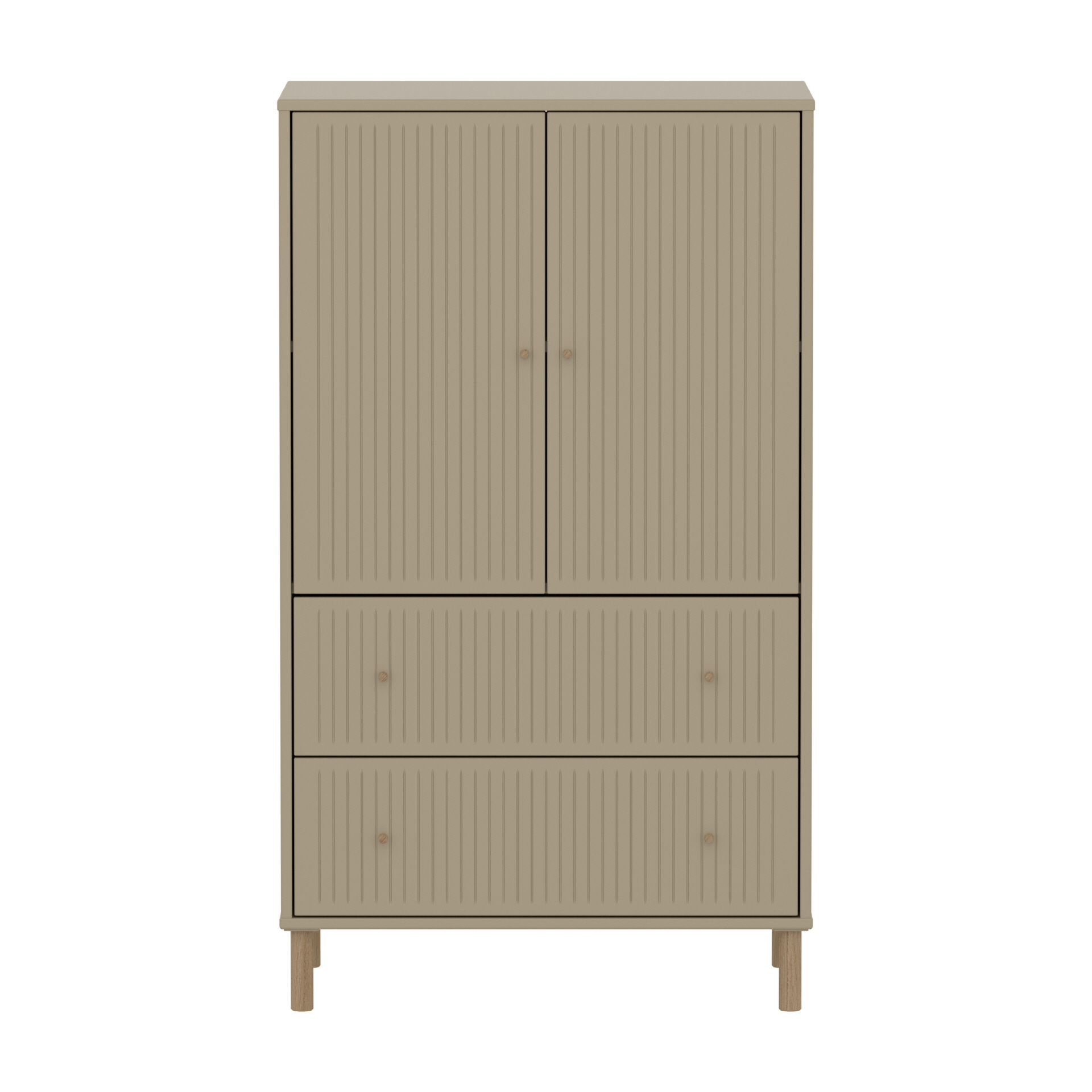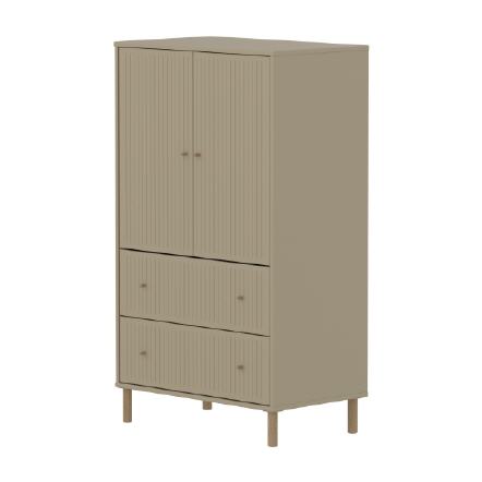 Der FLEXA SAGA Schrank verfügt über zwei Türen zwei Schubladen und einen verstellbaren Einlegeboden. Die Türen mit Soft Close Funktion und die Schubladen schützen kleine Finger und bieten eine elegante und leise Schließfunktion. Die runden Metallgriffe in der Farbe Oat sowie die gerillten Details an den Türen verleihen dem Schrank ein schlichtes und elegantes Design.