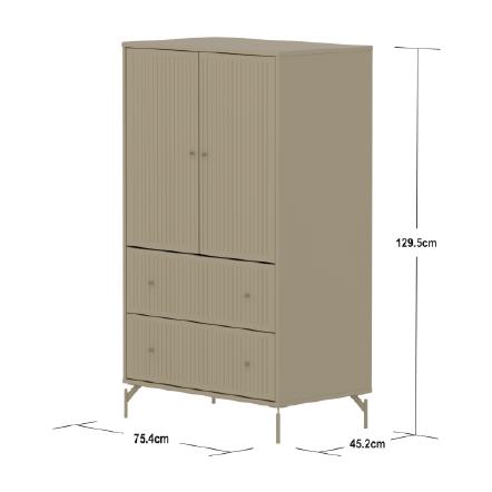 Der FLEXA SAGA Schrank verfügt über zwei Türen zwei Schubladen und einen verstellbaren Einlegeboden. Die Türen mit Soft Close Funktion und die Schubladen schützen kleine Finger und bieten eine elegante und leise Schließfunktion. Die runden Metallgriffe in der Farbe Oat sowie die gerillten Details an den Türen verleihen dem Schrank ein schlichtes und elegantes Design.