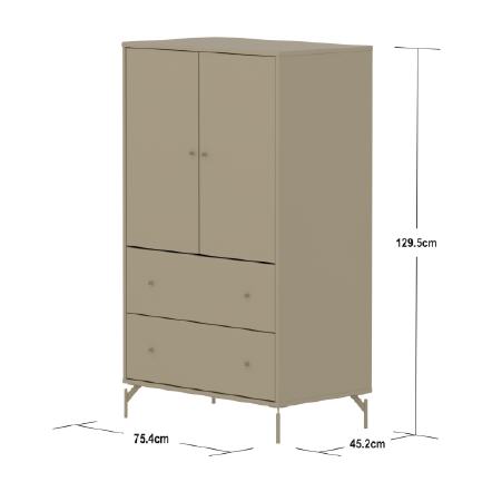 Der FLEXA SAGA Schrank verfügt über zwei Türen zwei Schubladen und einen verstellbaren Einlegeboden. Die Türen mit Soft Close Funktion und die Schubladen schützen kleine Finger und bieten eine elegante und leise Schließfunktion. Die runden Metallgriffe in der Farbe Oat verleihen dem Schrank ein schlichtes und elegantes Design.