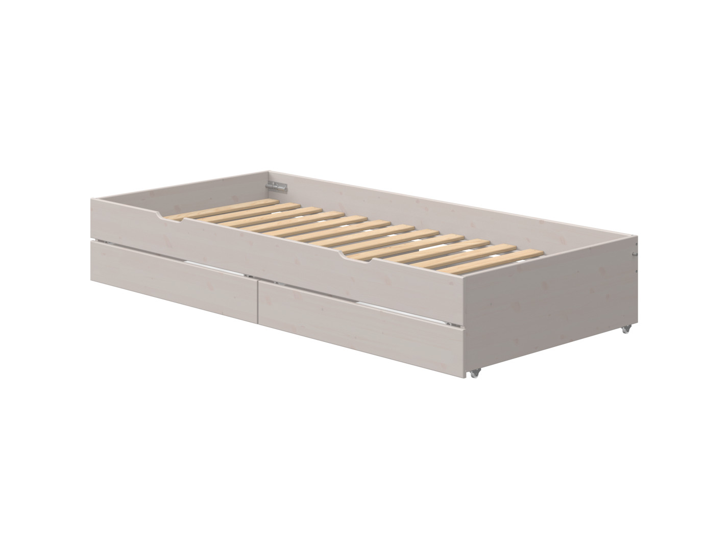 Ausziehbett mit 2 Schubladen. Inkl. Verlängerungspfosten und Laufrollen. Passend zum Classic Bett. Matratzenhöhe max. 12 cm. Matratzengröße=90x190 cm