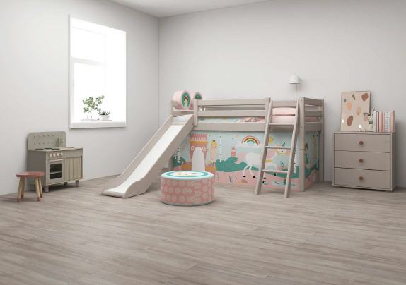 Halbhohes Classic Bett mit Rutsche und neuer Schrägleiter mit integrierten Griffen.
