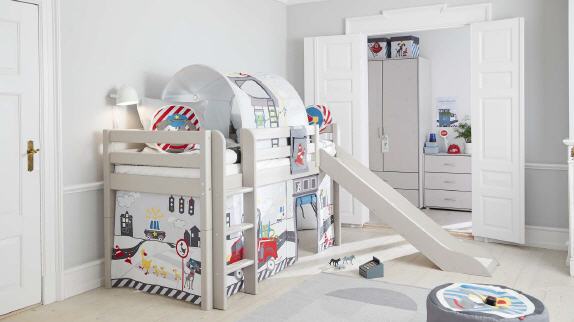 Halbhohes Classic Bett mit senkrechter Leiter und Rutsche. H:120 L:210 B:249 cm