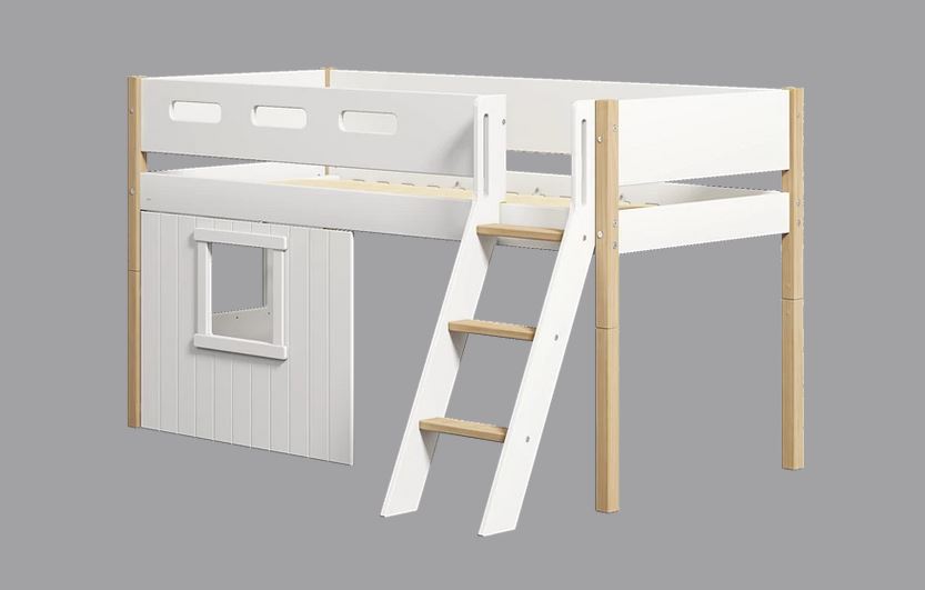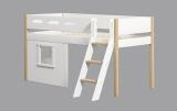 Halbhohes NOR Bett mit Hausfront und einer schrägen Leiter.