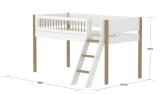 Halbhohes NOR Bett mit Schrägleiter und Absturzsicherung für Kinder. Die Leiter hat rutschfeste Stufen und integrierte Griffe und kann an beiden Bettenden aufgestellt werden. Der Raum unter dem halbhohen Bett eignet sich ideal als Stauraum.